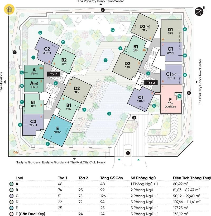 - Tòa 2: 204 căn hộ, mật độ 8 căn / sàn