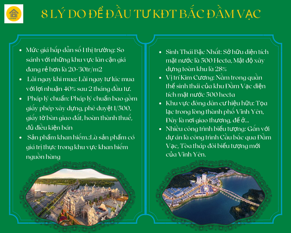 Khu đô thị sinh thái bậc nhất Việt Nam - KĐT Bắc Đầm Vạc nằm trong lõi của một trong những hồ sinh thái lớn nhất cả nước là Đầm Vạc, có diện tích mặt nước là 500 hecta, cùng với đó là các tuyến đường lớn bao quanh, kết nối thuận tiện đến các trung tâm hành chính ban nghành của Thành phố Vĩnh Yên xinh đẹp.